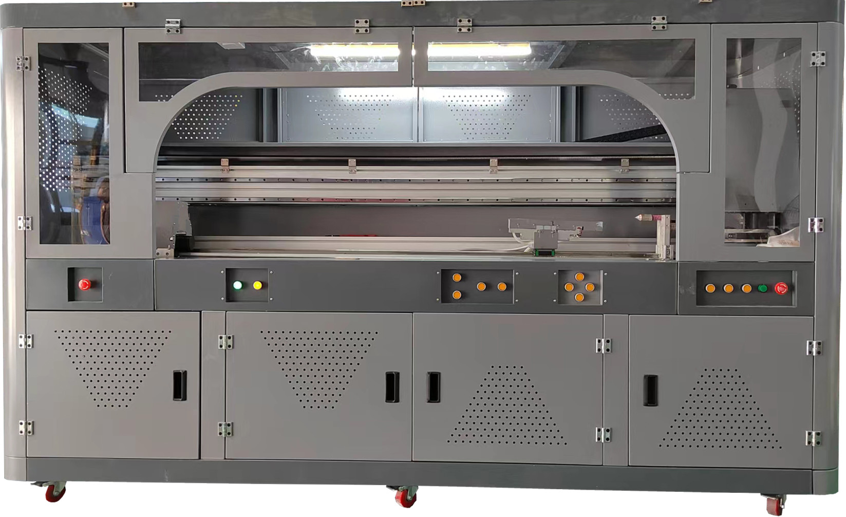 Percetakan silinder dapat diterapkan pada produk bahan baku datar: pelat porselen, kaca, akrilik, PVC, ABS, pelat organik, logam, kayu, plastik, batu, kulit, bahan bangunan,bahan dekorasi, silika gel, 3D stereoscopic painting grating plate, grating sheet dan kanvas lainnya, kanvas minyak, kain kotak cahaya dan bahan baku tak terbatas lainnya, cetakan warna gambar;Produk yang dapat diterapkan pada bahan melengkung: gelas termos, stereo bulat, botol anggur bulat, hadiah kerajinan bulat, dll. Orientasi pencetakan akurat, yang menghindari masalah offset orientasi yang dihadapi dalam pencetakan manual.